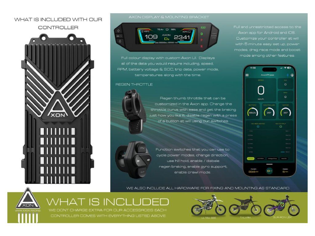 Barevný displej s vlastním UI od Axon Racing, přehled nastavení výkonu, režimů, stavu baterie apod.